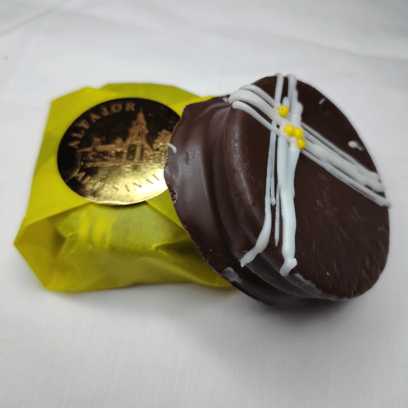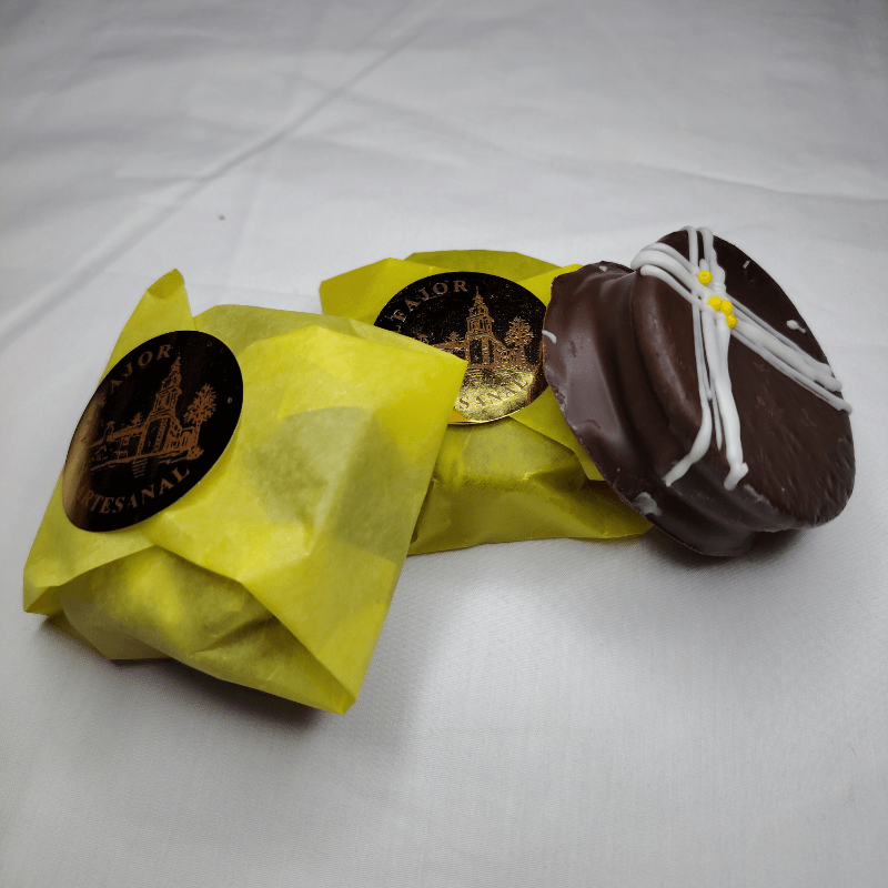 Elaborado con manjar, relleno de platano al centro y cobertura de chocolate semi amargo.