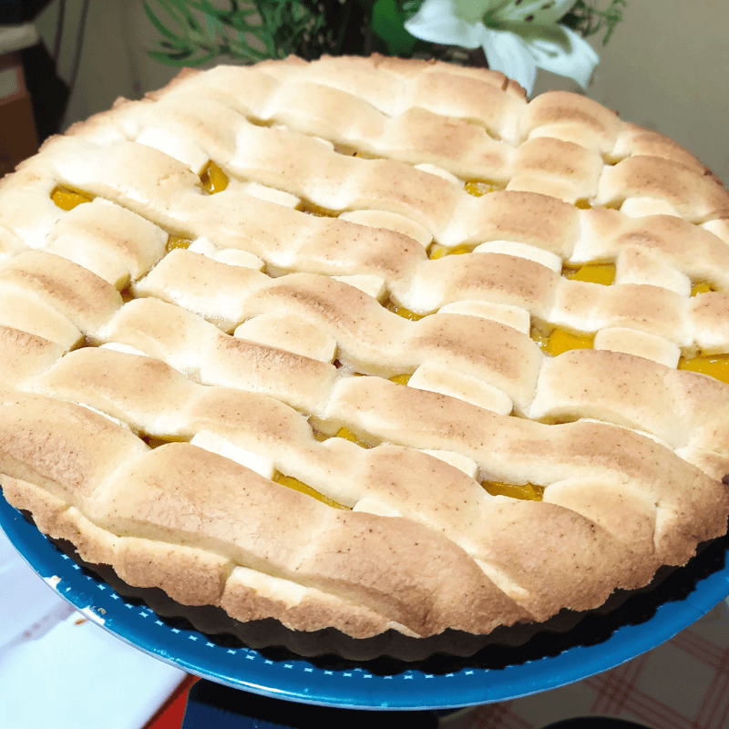 Delicioso kuchen elaborado con rodajas de durazno en conserva, azúcar rubia y canela.